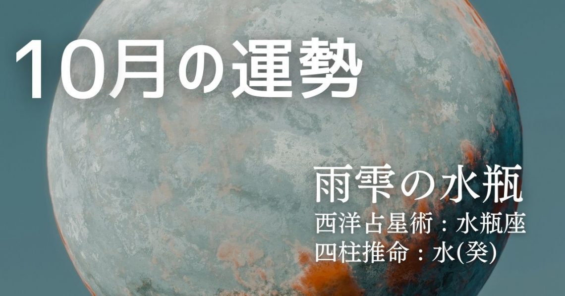 西洋占星術では、あなたは水瓶座タイプです。 四柱推命では、あなたは水(癸)タイプです。 そして、このふたつを融合したソラリタ・タイプでは、あなたは雨雫の水瓶タイプとなります。 ここでは、上記三つの占術であなたの10月の運…