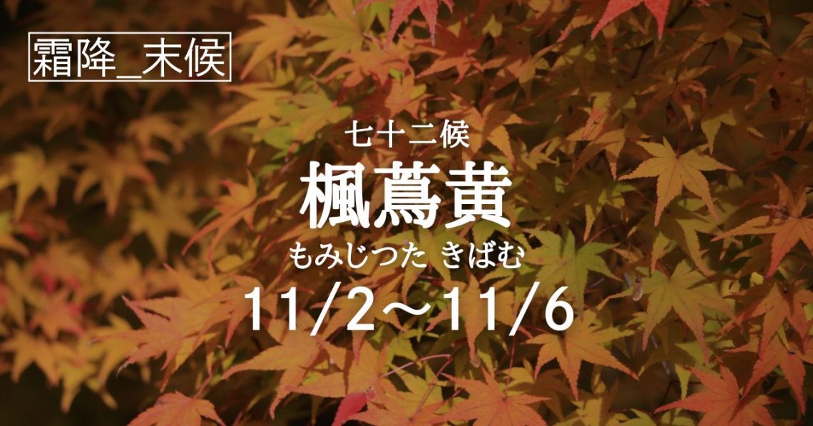二十四節気「霜降」の末候は七十二候「楓蔦黄(もみじ つた きばむ)」の5日間となります。 七十二候で「楓蔦黄(もみじ つた きばむ)」という時季に入ります。 紅葉シーズンがやってきました。楓は本来は「かえで」と読みますが…