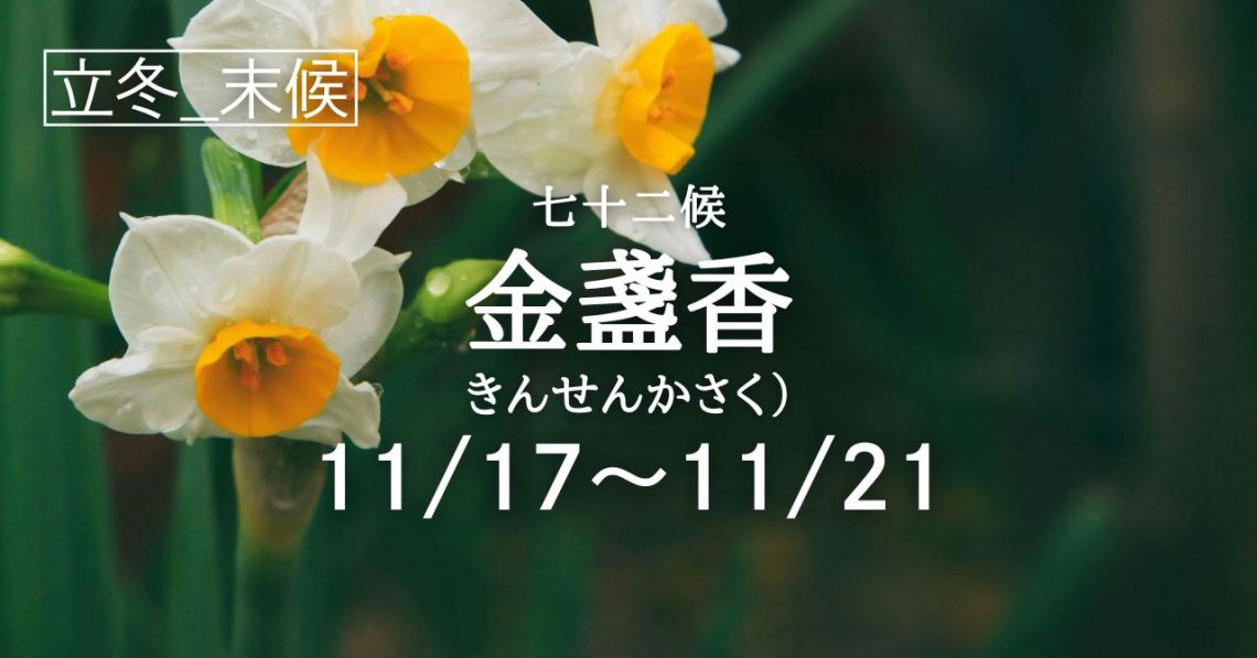 二十四節気「立冬」の末候は七十二候「金盞香(きんせんか さく)」の5日間となります。 七十二候で「金盞香(きんせんか さく)」という時季に入ります。 二十四節気の「冬至」もすでに終盤に入りました。金盞といっても春に咲くキ…
