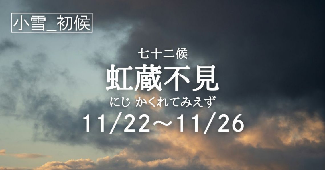 二十四節気「小雪」の初候は七十二候「虹蔵不見(にじ かくれて みえず)」の5日間となります。 七十二候で「虹蔵不見(にじ かくれて みえず)」という時季に入ります。 虹は空気中の水滴に太陽光が反射する現象です。なので、空…