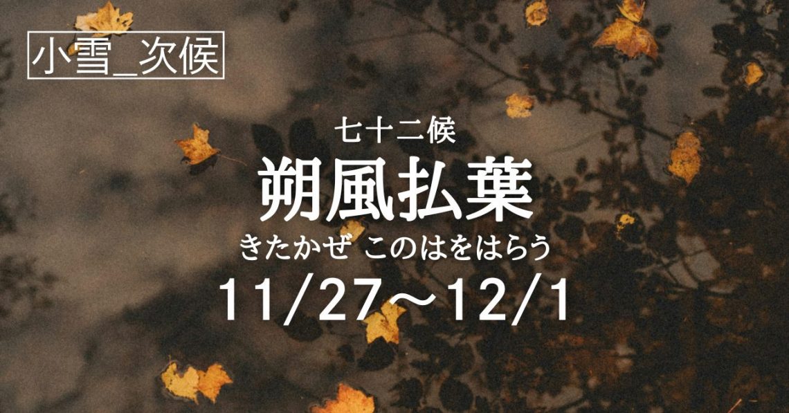 二十四節気「小雪」の次候は七十二候「朔風払葉(きたかぜ このはをはらう)」の5日間となります。 七十二候で「朔風払葉(きたかぜ このはをはらう)」という時季に入ります。 「朔」は新月のことを表します。昔は月の満ち欠けに基…