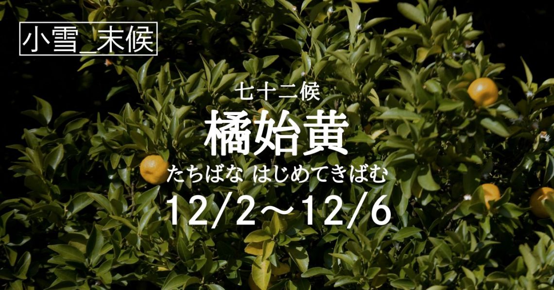 二十四節気「小雪」の末候は七十二候「橘始黄(たちばな はじめてきばむ)」の5日間となります。 七十二候で「橘始黄(たちばな はじめてきばむ)」という時季に入ります。 橘(たちばな)は、古くから日本に自生している固有の柑橘…
