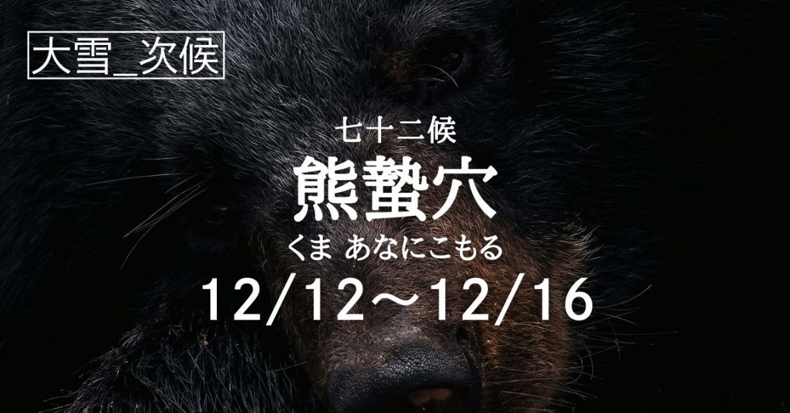 二十四節気「大雪」の次候は七十二候「熊蟄穴(くま あなにこもる)」の5日間となります。 七十二候で「熊蟄穴(くま あなにこもる)」という時季に入ります。 熊が穴にこもる。つまり冬眠に入るということです。厳しい冬の寒さを乗…