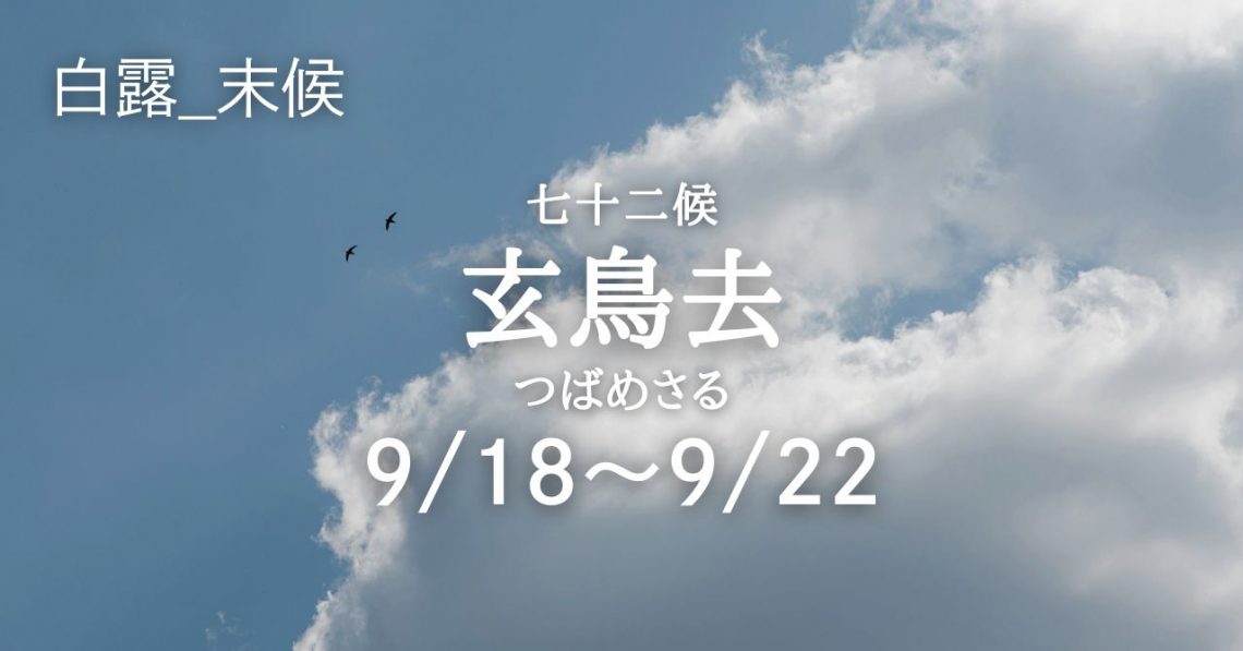 二十四節気「白露」の末候は七十二候「玄鳥去(つばめ さる)」の5日間となります。 春先にやってきたツバメが帰り始める時季となりました。子育てを終えたツバメは、暖かさを求めて南へと渡りはじめます。4月4日に「玄鳥至 (つば…