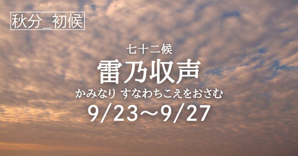 二十四節気「秋分」の初候は七十二候「雷乃収声(かみなり すなわち こえをおさむ)」の5日間となります。 夏に鳴り響いた雷が収まる時季に入りました。ちょうど秋分の日を迎えると同時に、この七十二候もこの「雷乃収声(かみなり …