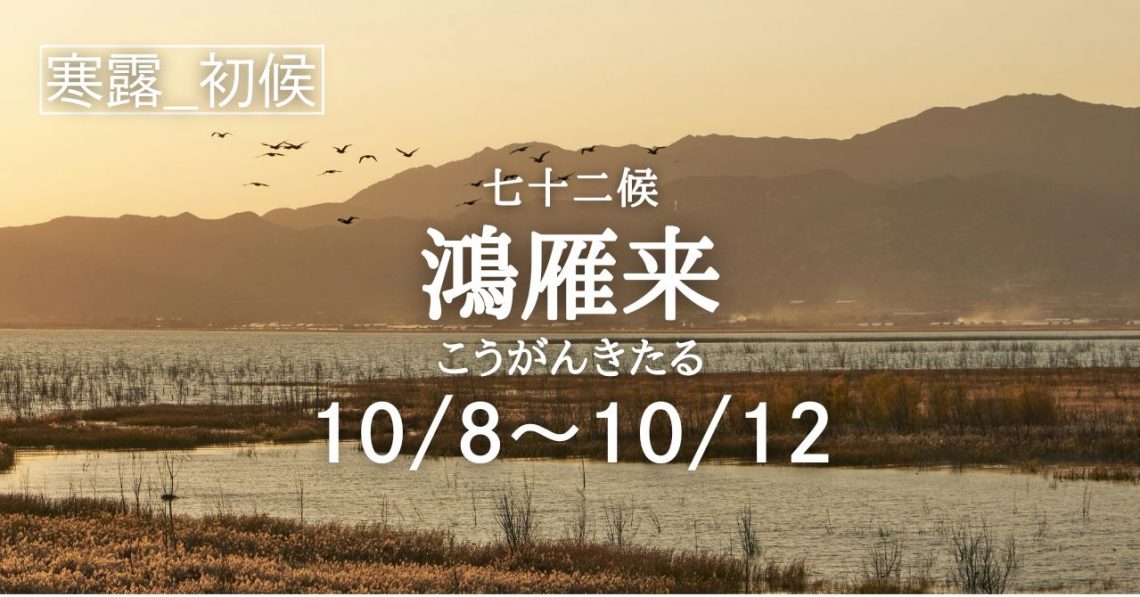 二十四節気「寒露」の初候は七十二候「鴻雁来(こうがん きたる)」の5日間となります。 七十二候で「鴻雁来(こうがん きたる)」という時季に入ります。 秋の渡り鳥である雁が冬を越すために北方から飛来してくる時季、という意味…
