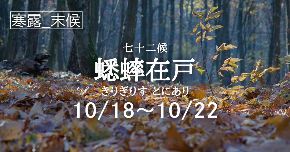 二十四節気「寒露」の末候は七十二候「蟋蟀在戸(きりぎりす とにあり)」の5日間となります。 七十二候で「蟋蟀在戸(きりぎりす とにあり)」という時季に入ります。 蟋蟀とはキリギリスのことですが、コオロギとする説が有力です…