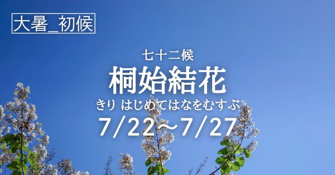 二十四節気「大暑」の初候は七十二候「桐始結花(きりはじめてはなをむすぶ)」の6日間となります。 暦の上で一年で最も暑い季節、二十四節気で「大暑」を迎えると同時に、七十二候では「桐始結花」の季節に入ります。桐の花が開くのは…