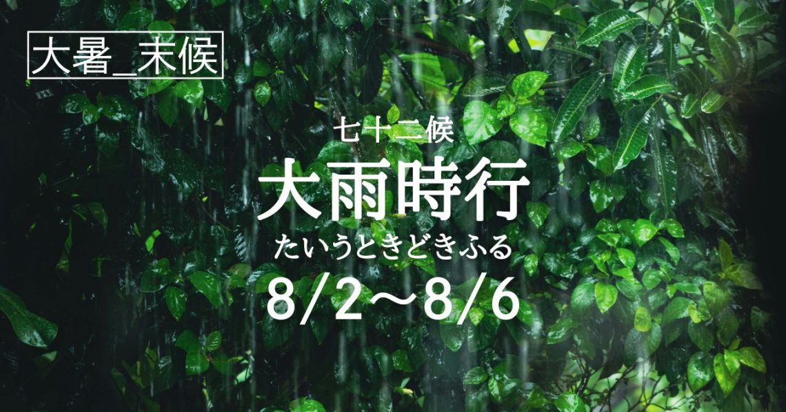 二十四節気「大暑」の末候は七十二候「大雨時行 (たいうときどきふる)」の5日間となります。 「大暑」の季節も終盤となっています。実際はこれからが本番という感じですが、暦の上では今がもっとも暑い季節であり、その終盤を迎えて…
