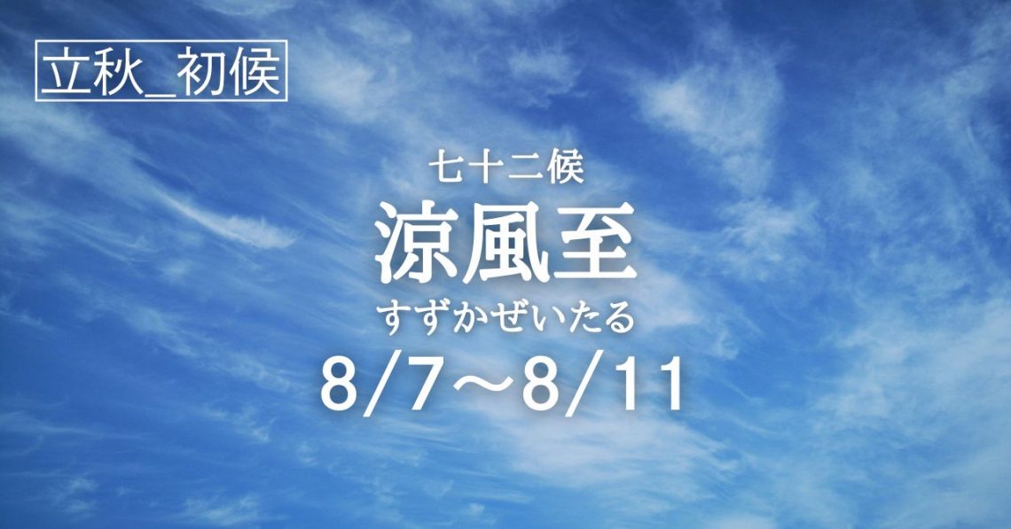 二十四節気「立秋」の初候は七十二候「涼風至(すずかぜいたる)」の5日間となります。 二十四節気で「立秋」を迎えると同時に、七十二候は「涼風至」となります。季節は少しずつ秋に向かい、涼しげな風が吹く時季という意味。いま一年…
