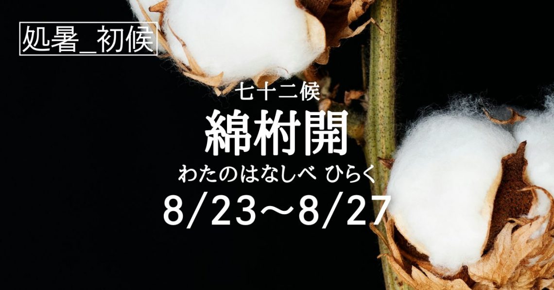 二十四節気「処暑」の初候は七十二候「綿柎開(わたのはなしべ ひらく)」の5日間となります。 二十四節気で「処暑」を迎えると同時に、七十二候では「綿柎開」という時季に入ります。 「柎」とは花の「がく」のことを言います。綿の…