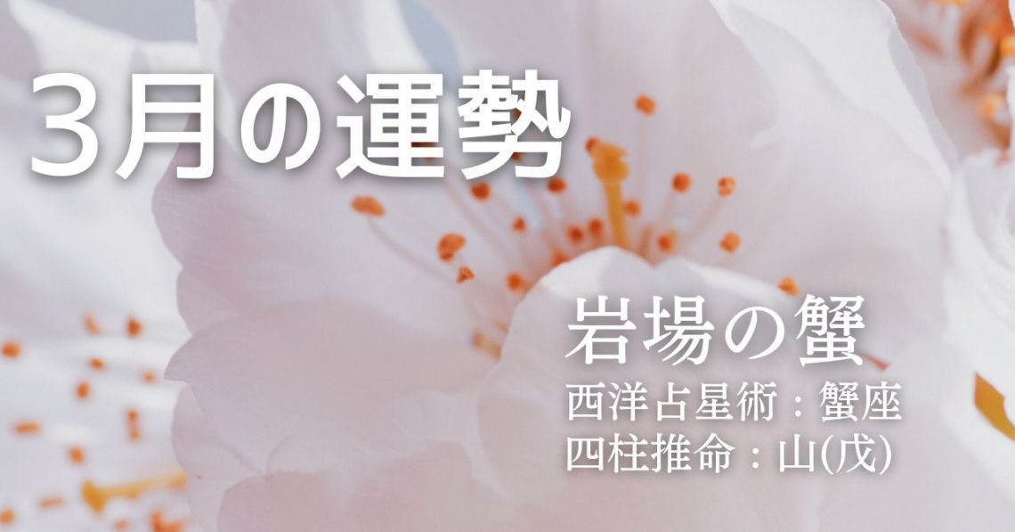 西洋占星術で蟹座タイプ、四柱推命で山(戊)タイプの人の3月の運勢 西洋占星術では、あなたは蟹座タイプです。 四柱推命では、あなたは山(戊)タイプです。 そして、このふたつを融合したソラリタ・タイプでは、あなたは岩場の蟹タ…