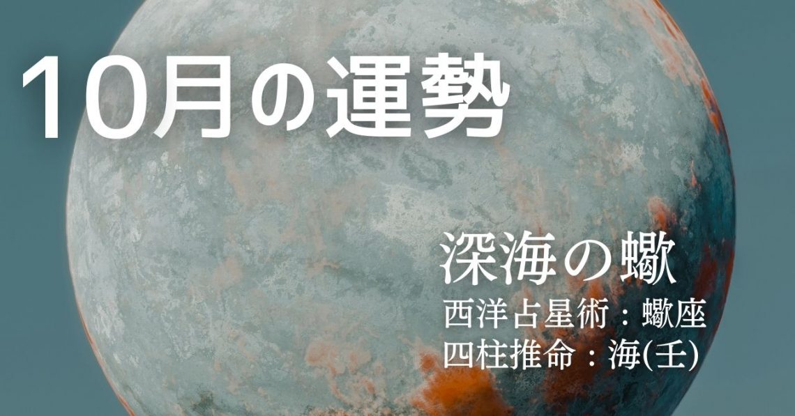 西洋占星術では、あなたは蠍座タイプです。 四柱推命では、あなたは海(壬)タイプです。 そして、このふたつを融合したソラリタ・タイプでは、あなたは深海の蠍タイプとなります。 ここでは、上記三つの占術であなたの10月の運勢を…