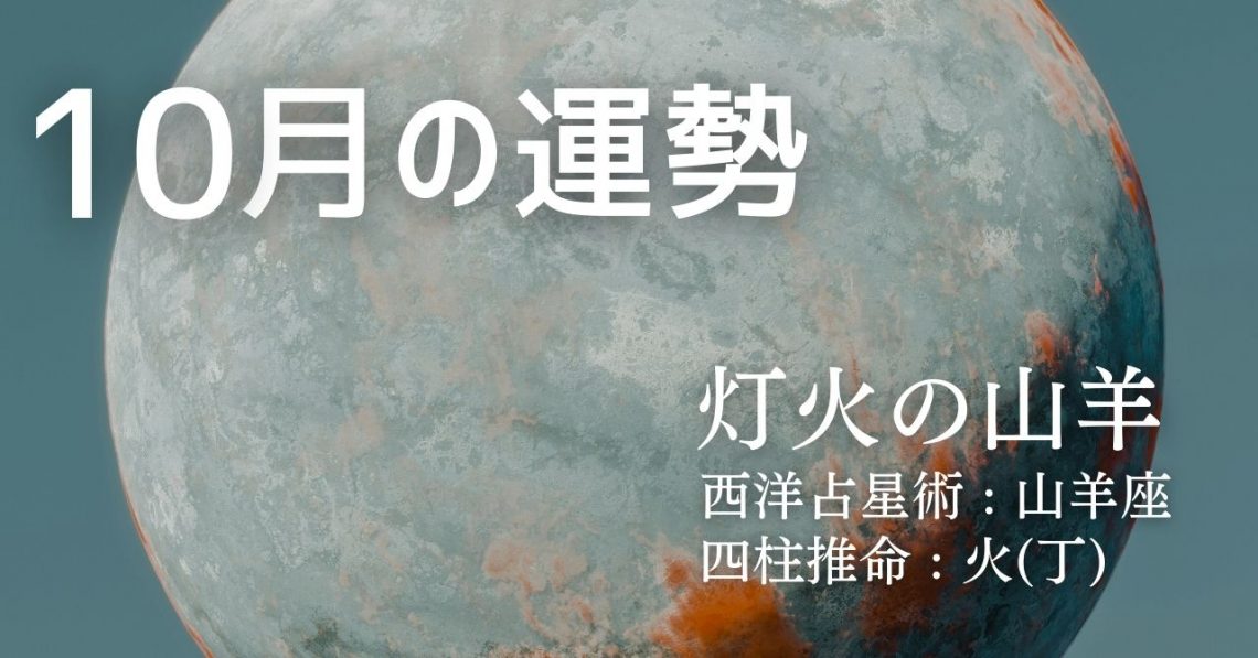 西洋占星術では、あなたは山羊座タイプです。 四柱推命では、あなたは火(丁)タイプです。 そして、このふたつを融合したソラリタ・タイプでは、あなたは灯火の山羊タイプとなります。 ここでは、上記三つの占術であなたの10月の運…