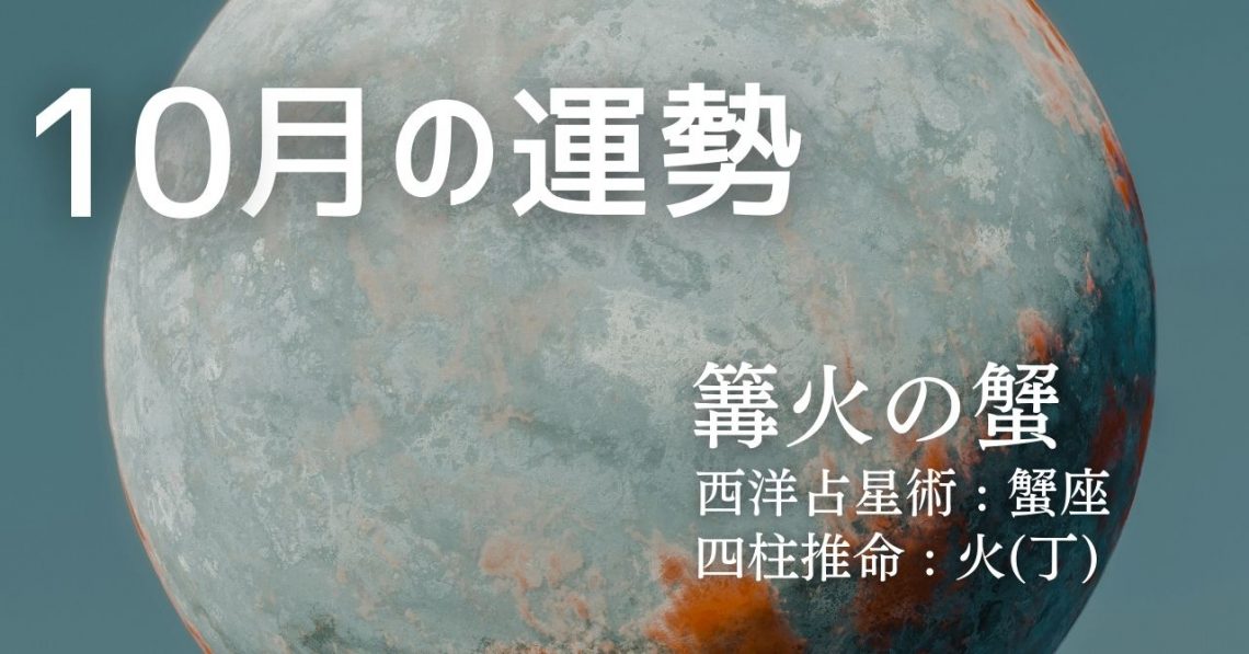 西洋占星術では、あなたは蟹座タイプです。 四柱推命では、あなたは火(丁)タイプです。 そして、このふたつを融合したソラリタ・タイプでは、あなたは篝火の蟹タイプとなります。 ここでは、上記三つの占術であなたの10月の運勢を…