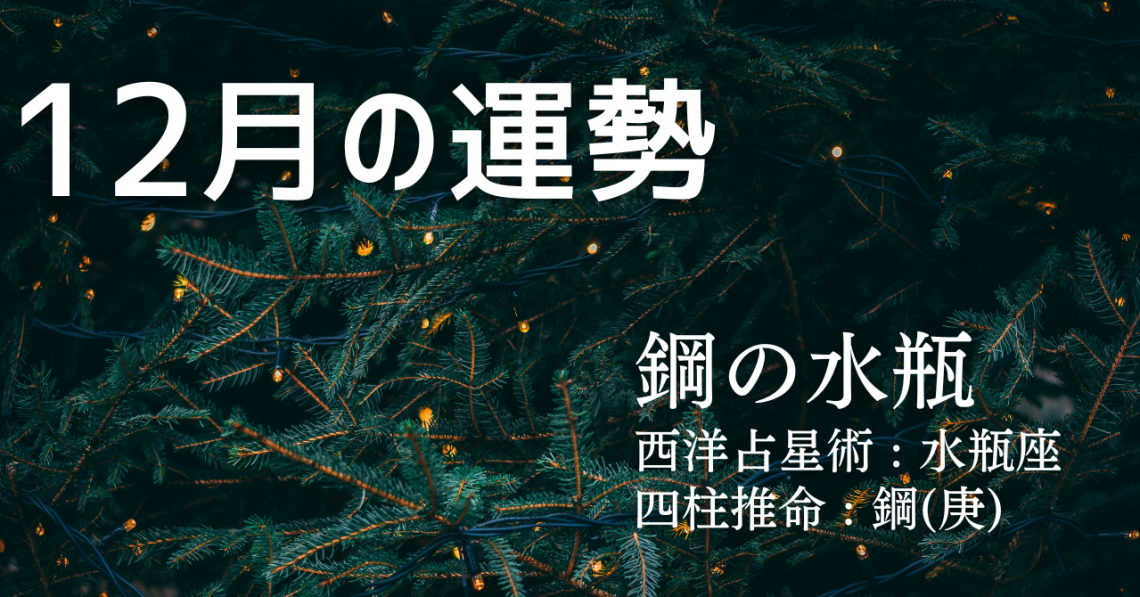 西洋占星術で水瓶座タイプ、四柱推命で鋼(庚)タイプの人の12月の運勢 西洋占星術では、あなたは水瓶座タイプです。 四柱推命では、あなたは鋼(庚)タイプです。 そして、このふたつを融合したソラリタ・タイプでは、あなたは鋼の…